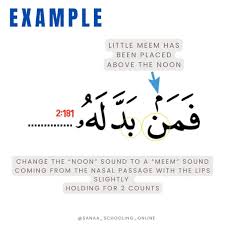 - Within a single word: When a Noon Sakinah or Tanween appears directly before a Baa in the same word, reciters convert it into a nasal “M” sound with Ghunnah to ensure smooth recitation.